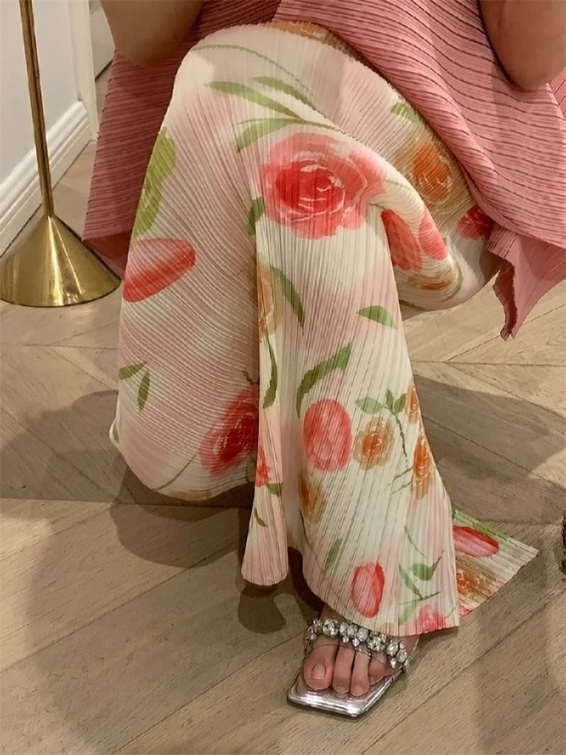 キュートな花柄と軽やかなプリーツが魅力のスカート。華やかな印象で、女性らしさを引き立てます。長く愛用できるデザインで、様々なトップスとの相性も抜群です。